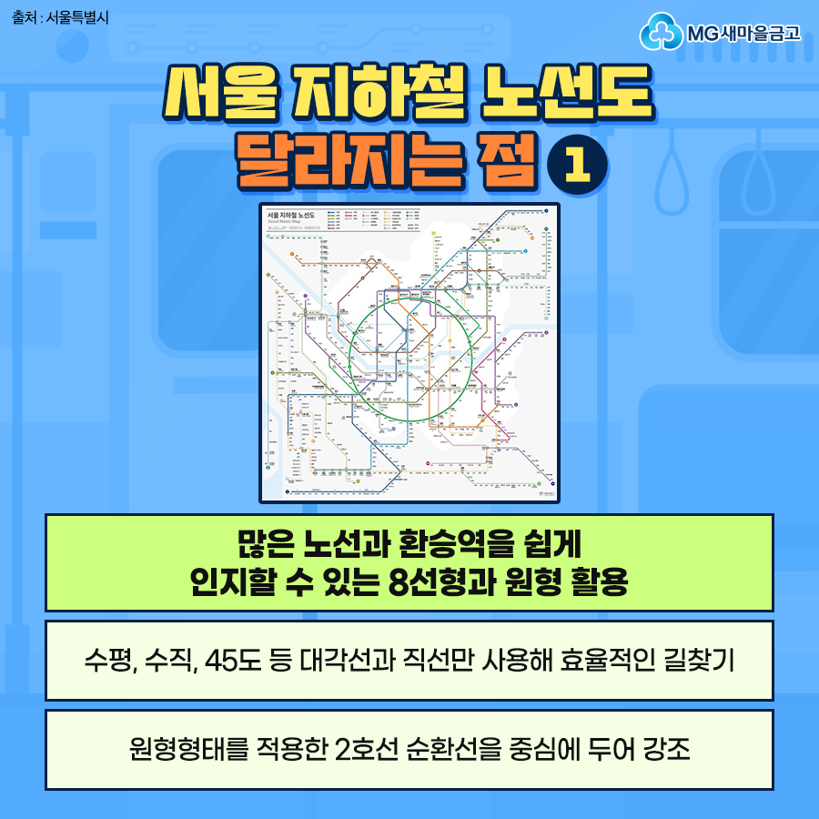 지하철 2호선을 서울 도심의 중심축으로 삼아 원형으로 표현하고, 나머지 노선을 중심축에서 퍼지는 형태로 배치해 전체적인 가독성과 공간 인지력을 대폭 향상시켰습니다.